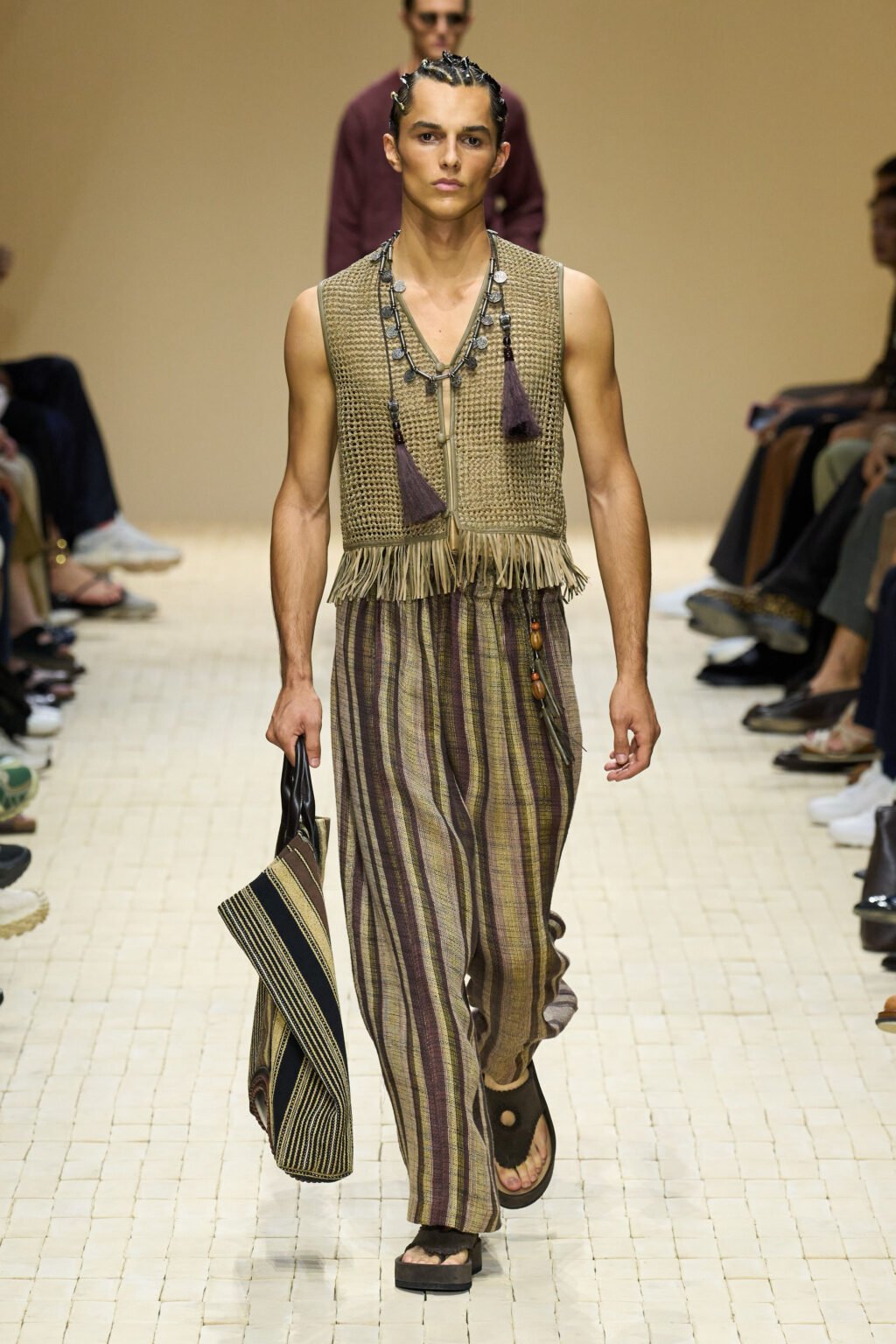 Armani kommer mest att förknippas med den lösa och okonstruerade kostymen som fick ett genomslag på 1980-talet, framför allt i filmen American Gigolo med Richard Gere. Men Armanis sista kollektion (Emporio Armani) för kommande vår har ett tydligt bohemiskt tema – urtvättade tyger, mjuka material, stickat, fransar och sandaler i naturfärger. Boho chic, kallas det på modespråk. Våga släppa loss våren 2026!