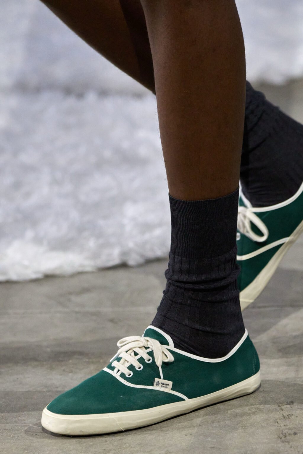 Nu är den här, motreaktionen på de klumpiga löparskorna (hej Balenciaga) som dominerat modebilden länge. Nya, moderna sneakers anno 2026 är små, lätta, minimalistiska och med en tydlig retro-look. På bilden syns Pradas modell för kommande vår vars design är inspirerad av tidiga tenniskor. Materialet är slitstark kanvas. Till den här kategorin kan vi även addera Our Legacys uppmärksammade samarbete med Converse och den ikoniska All Star-kängan.