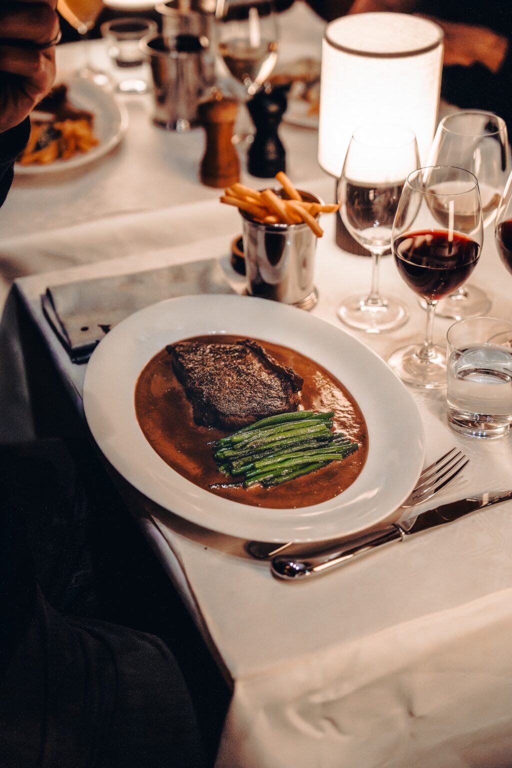 På menyn står amerikanska tolkningar av franska klassiker, som rätter som King Crab Legs, New York Strip och Shrimp Cocktail, liksom hedonistiska signaturrätten Toast G.A.T. med stekt anklever, oxfilé och caviar.