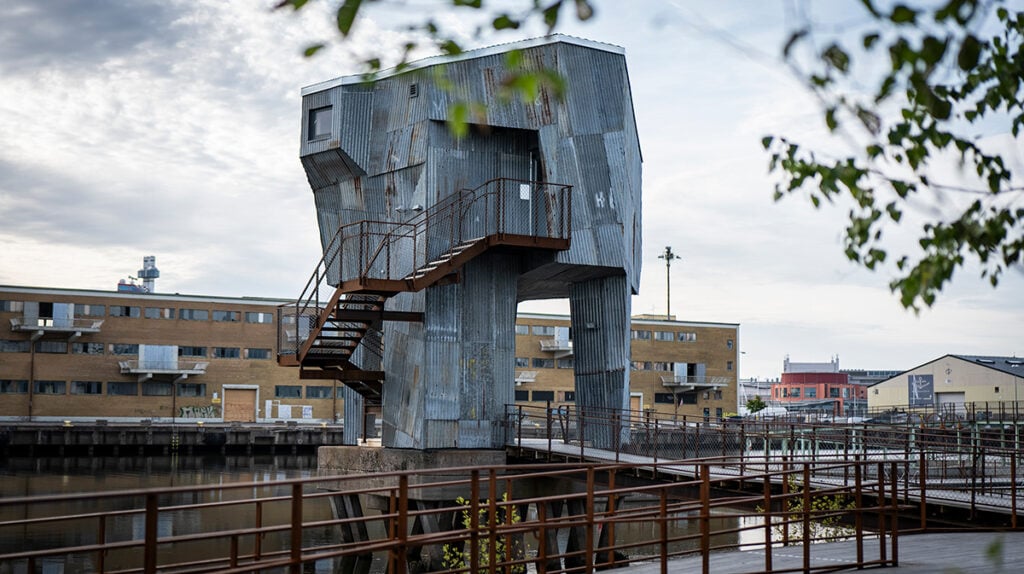 I anslutning till ”Trosten”, en flytande bastu i Oslo, finns en stor amfiteater klädd i grön, återvunnen aluminium. Bastun är ritad av Estudio Herreros som också har skapat Munchmuseet i bakgrunden.