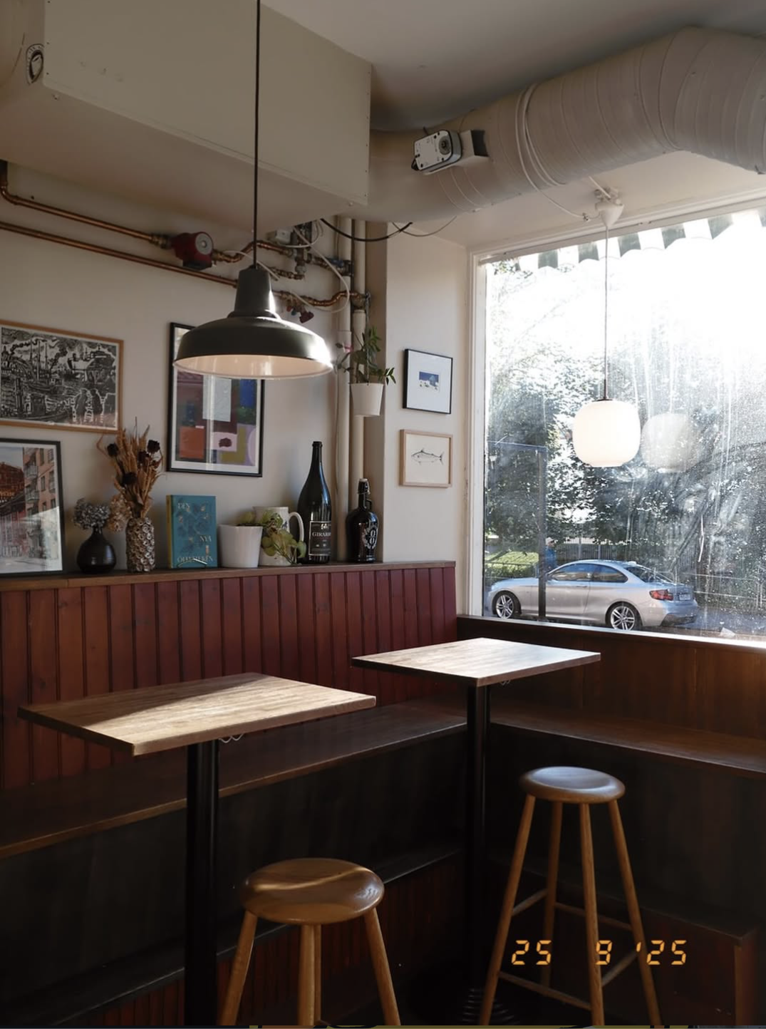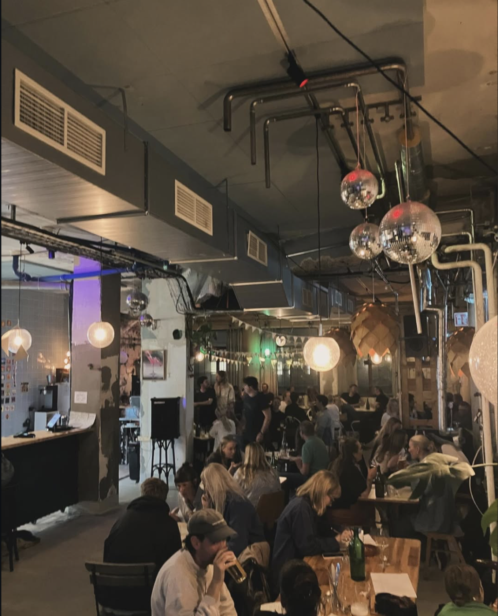 Menyn visas på gamla tjockteve-apparater, baren är omringad av plastväxter och grönsakerna kommer från den urbana odlingen utanför dörren. Industrilokalens gamla takfönster släpper in dagsljuset under dagen. Dagsljus som byts ut mot neon och techno när solen går ner. Håll koll på spelschemat!