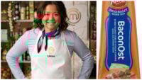 3. Kläm ut baconosten och bred den som smör. Ringla över kaviar.