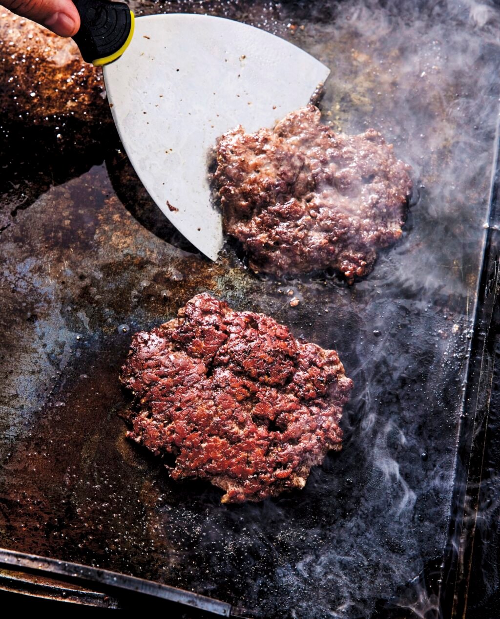 - Höj värmen till cirka 250 grader. Lägg på köttbollarna och pressa dem med jämnt tryck till cirka 1 ½ cm tjocklek med ett smashverktyg i cirka 10 sekunder så att köttet får bra kontakt med ytan. Krydda generöst med salt och peppar.