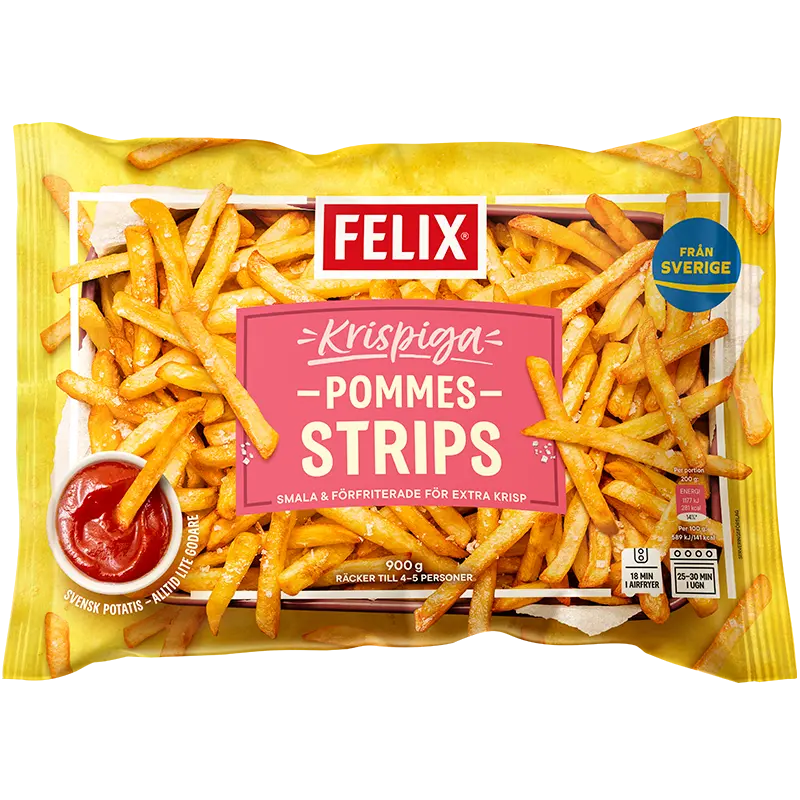 Bästa friteringspommes blev Felix Ekologiska gårdspommes tätt följt av Felix Pommes strips. Både fick fin färg, krämigt inre och frasigt yttre. Extra plus för att de innehåller svensk potatis och få tillsatser.