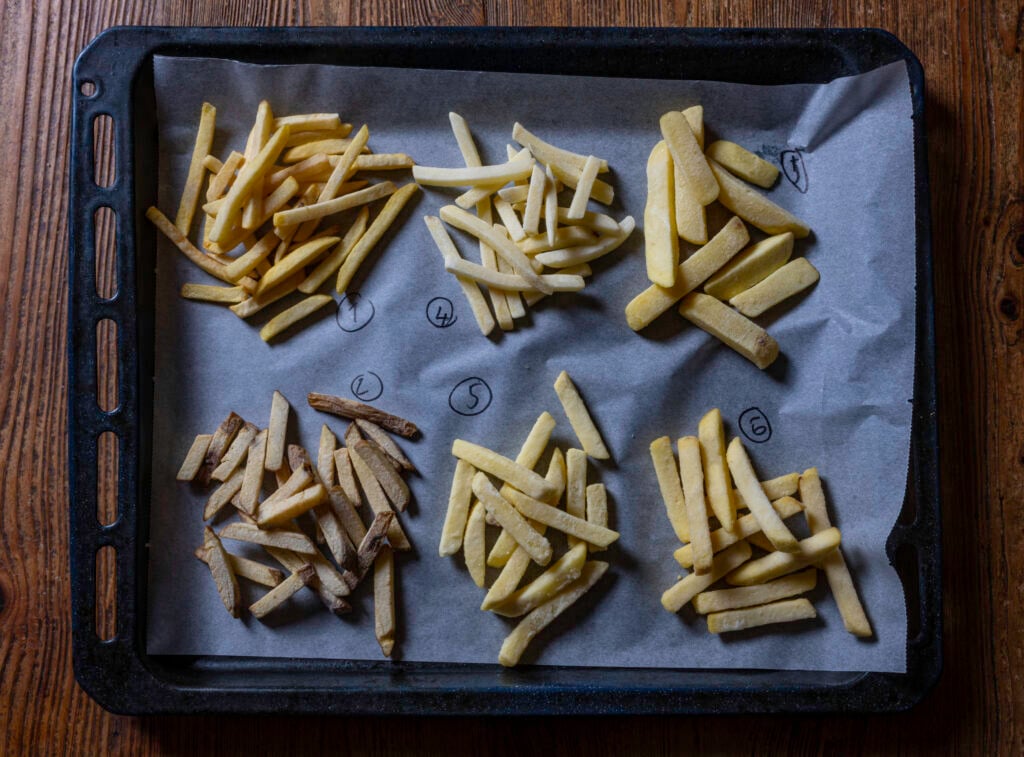 Sex påsar av våra vanligaste, oräfflade fryspommes köptes in och tillredes med två olika tillagningsmetoder: genom fritering och ugnsbakning. Sex mycket erfarna pommesälskare (det vill säga jag och min sambo samt tonårsbarn) genomförde testet blint vilket gjorde att vi enkelt kunde jämföra sorterna utan att påverkas av eventuella favoriter och pris.