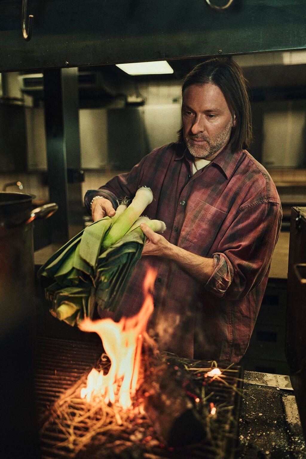Ekstedt har byggt ut sedan jag var här sist. Matsalen har blivit avsevärt större, köket också. Men allt kretsar fortfarande kring elden och röken. I köket råder full aktivitet, jag får trycka mig mot väggen för att inte komma i vägen. September. Folk har börjat hitta tillbaka till restaurangerna. En av Ekstedts sous chefs lägger ett gråpäron i elden, prepp inför kvällens service. Fullbokat för många veckor framöver.