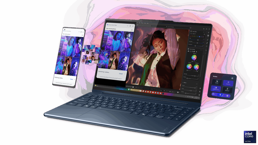 Lenovo Yoga 9i 2-in-1 är fullproppad med smarta AI-funktioner. Smart Share ansluter till exempel din smartphone till din bärbara dator direkt via en virtuell AI-sensor. Nudda bara på din dator med en Android eller iOS-enhet, sedan är det bara att dra och släppa bilderna du vill dela. En annan fiffig funktion är Smart Mode – en produktivitetsapp som gör det möjligt att automatisera vanliga uppgifter, gruppera inställningar och optimera systemets prestanda.