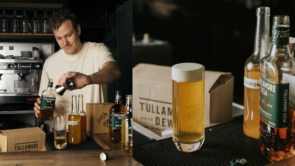Hetta upp ett passande glas med kokhett vatten. När du väl blandar i övriga ingredienser ska det inte svalna på en gång, det är samma princip som när kockar hettar upp sina tallrikar.