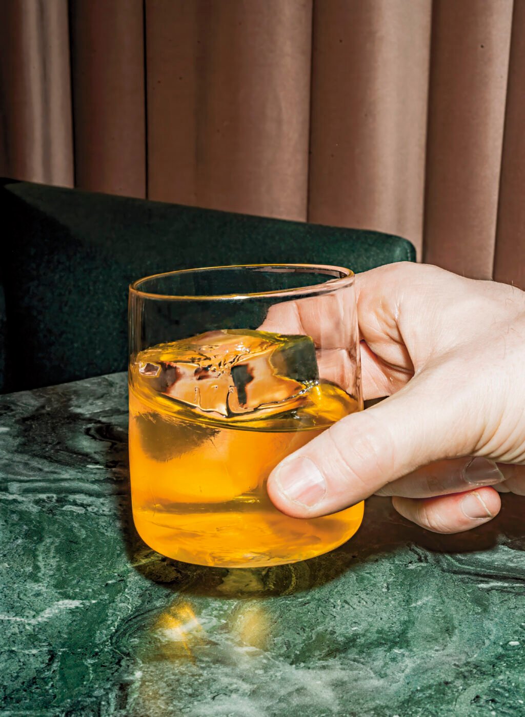En Old fashioned passar lika bra före maten som till maten eller efter maten. Det är en följeslagare som du alltid kan lita på för att höja stämningen på en fest – alla vill väl diskutera ration mellan socker och bourbon, hur många skvättar bitter du ska köra eller vilken typ av is det ska vara i? I originalet är det whisky, socker, bitter och is, men jag tycker den här varianten är bättre, mest för att jag är en riktig sucker för punsch.