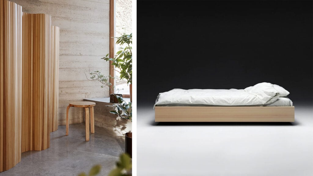 Här syns bland annat skärmväggen Screen 100A, en vågformad rumsavdelare i furu som tillverkas av Artek sedan 1930-talet. Kombinationen av form och funktion är genial och väggen har blivit en verklig designklassiker.