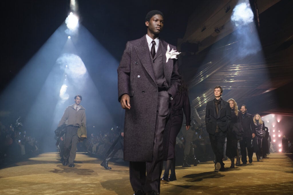 De nostalgiska influenserna syntes bland annat i dubbelknäppta powerkostymer, paisleymönstrade sidenslipsar, pilotjackor i skinn och byxor instoppade i boots. Färger: midnattsblått, rökgrått, oliv, rostrött, svart och brunt.