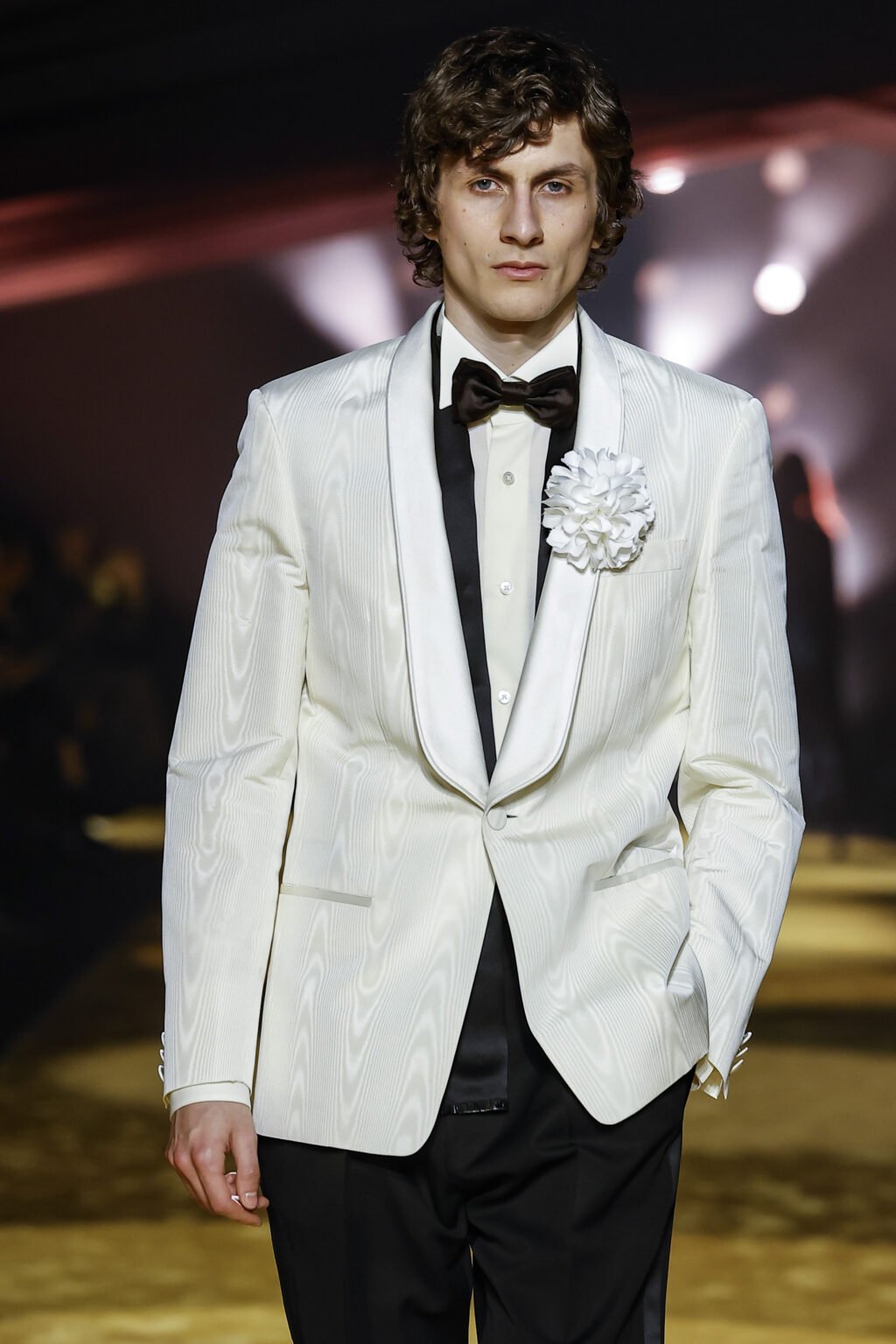 Cafés favorit var den vita smokingjackan som kom ut på catwalken i slutet av visningen – snacka om tidlös i sin elegans.