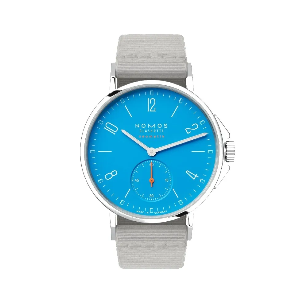 Namnet avslöjar mycket – Ahoi är det internationella sättet att ropa till ett skepp. Väljer du Siren Blue (blåare än Rutger Hauers ögon i Blade Runner) eller Siren Red får du en semesterklocka som fungerar lika bra resten av året. Boetten mäter 36,3 mm och den genomtänkta kronbeskyddaren ger ett harmoniskt intryck. Inuti tickar NOMOS egen automatiska kaliber DUW 3001 med 43 timmars gångreserv. Klockan är vattentät ner till 200 meter och levereras på ett vävt textilband tillverkat i Frankrike.
