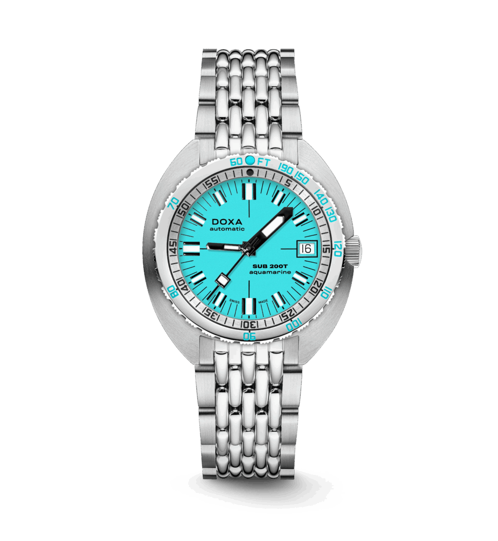 Doxa är känt för sina orangefärgade urtavlor – en färg som på 1960-talet valdes för att vara mest lättläst under vatten. I dag erbjuder märket flera färgalternativ, bland annat den semesterinspirerade Aquamarine-versionen av SUB 200T på 39 mm, som för tankarna till dykning och tropiska drinkar. Modellen är vattentät ner till 200 meter, utrustad med ett automatiskt Sellita SW200-1-verk och kan fås med länk eller gummiband.