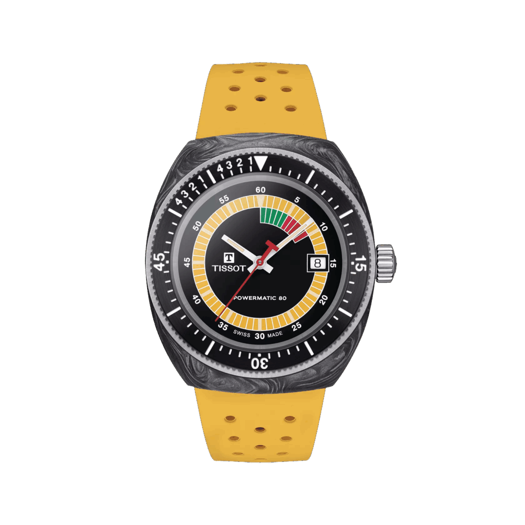 Sideral bjuder på djärva färger och en design som nästan gränsar till det pråliga – men det är också en del av dess charm. Trots den sportiga looken väger den bara 90 gram och tack vare de utbytbara perforerade gummibanden är den bekväm att bära i alla temperaturer. Boetten i formgjuten kolfiber mäter 41 mm och är vattentät ner till 300 meter. Inuti sitter Tissots Powermatic 80-verk med 80 timmars gångreserv, kompletterat med skruvkrona och safirglas på baksidan. Finns i gult, rött och blått.
