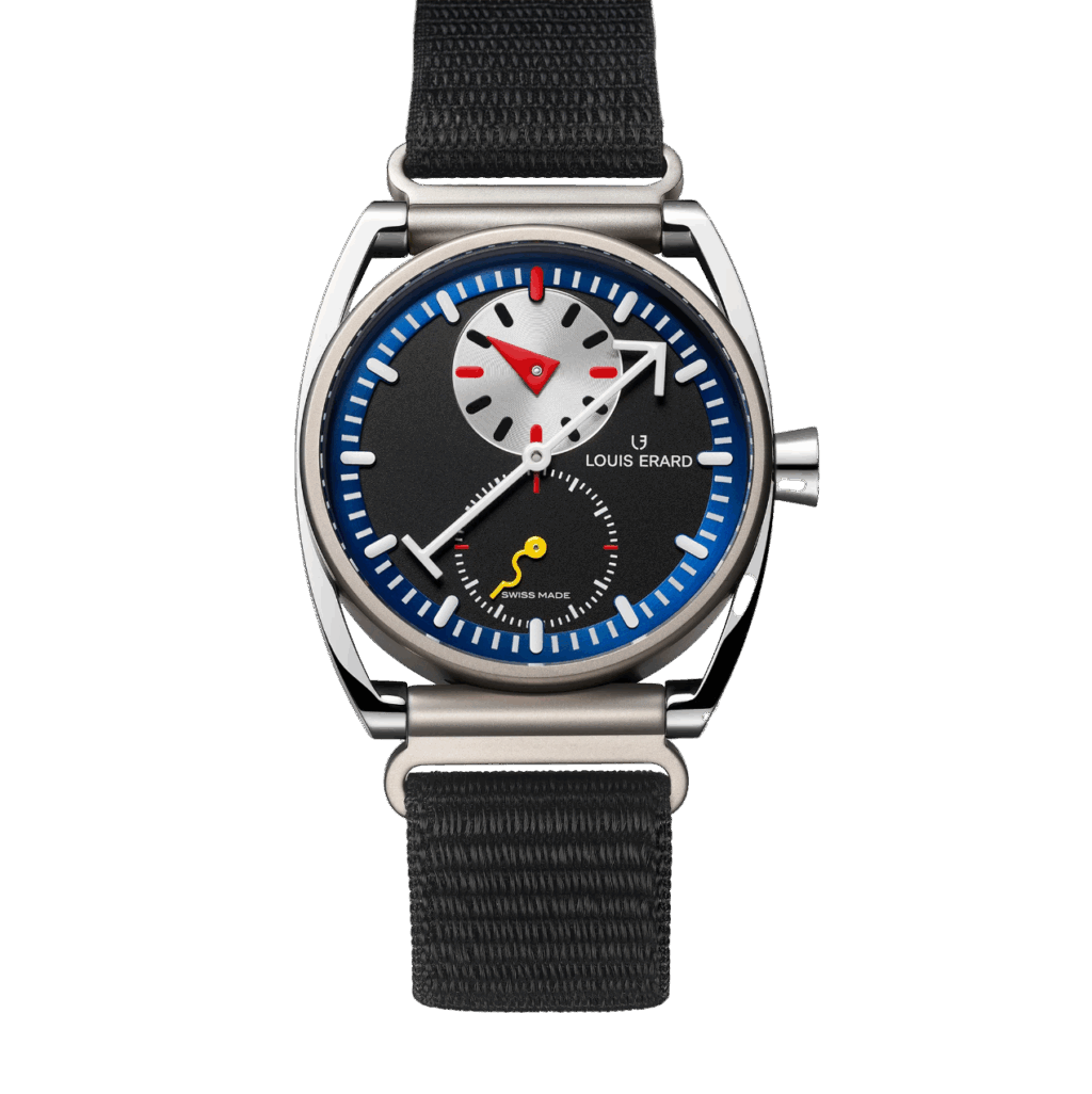 Vid första anblicken kan den se lekfull ut – nästan som en barnklocka – men detta är en tekniskt avancerad och designmässigt banbrytande modell. Louis Erard är kända för sina samarbeten med några av klockvärldens största namn. Här har de tagit fram en limiterad upplaga om 178 exemplar tillsammans med den franske designern Alain Silberstein. Resultatet är en 40 mm stor titanboett i Bauhaus-inspirerad stil, fylld med färger som räcker hela semestern. Den vita visaren anger minuter, den röda triangeln timmar och den gula ormliknande visaren visar sekunder.