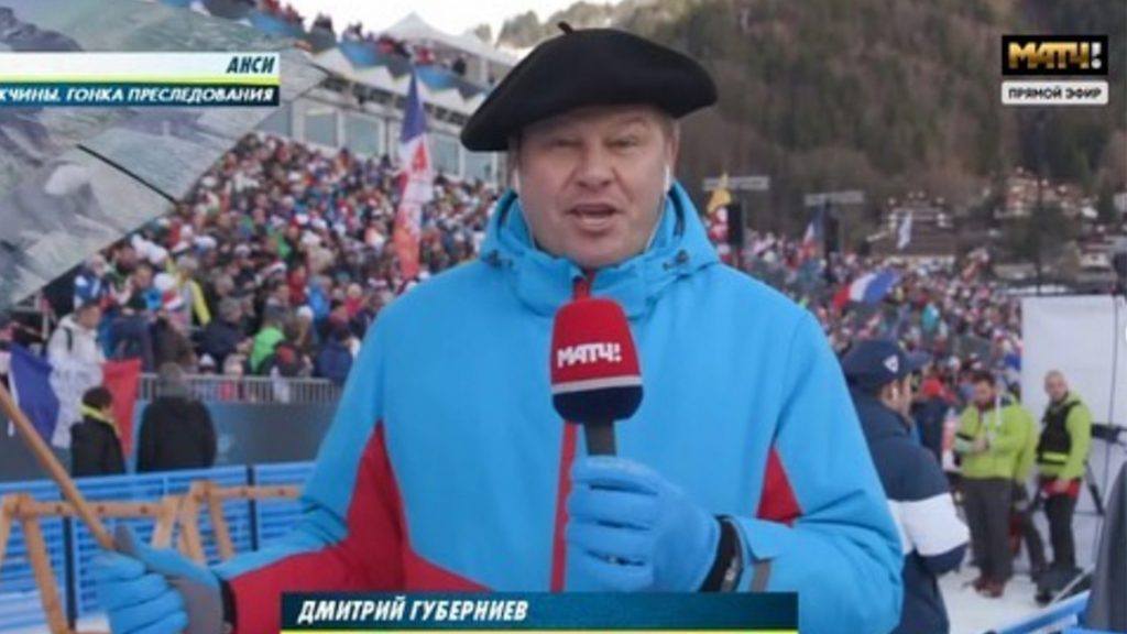 Den excentriske sportkommentatorn Dmitry Guberniev skriker fram ryska framgångar i skidskyttespåren – och kommenterar Eurovision i rysk tv.