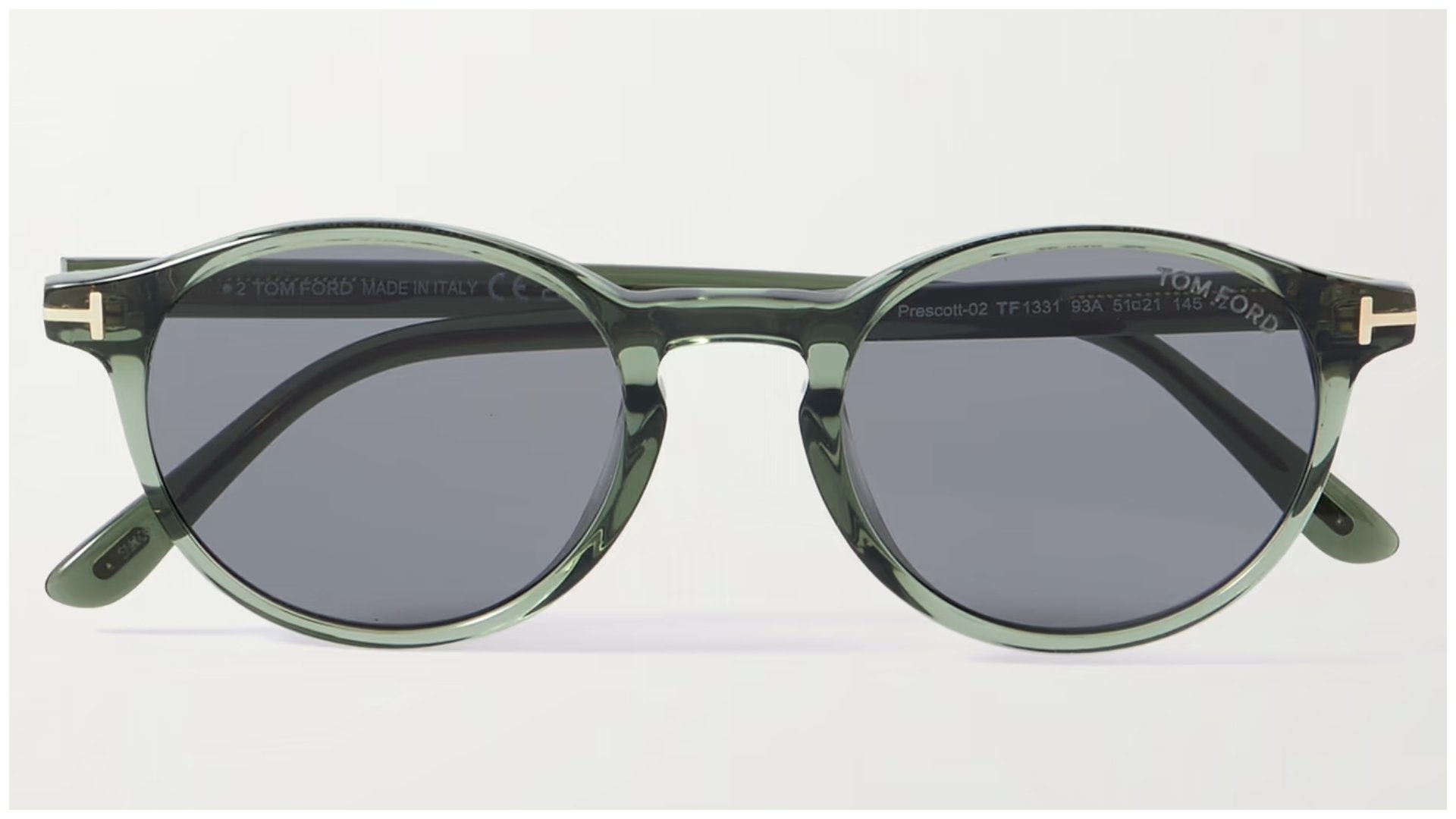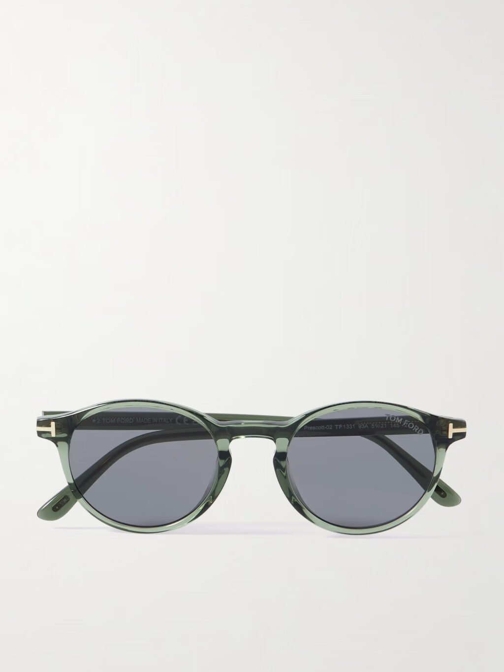 Tom Fords populära modell Prescott är gjorda i genomskinlig acetat och vilar på smala skalmar med märkets karakteristiska ”T”-detalj inlagd vid tinningarna.