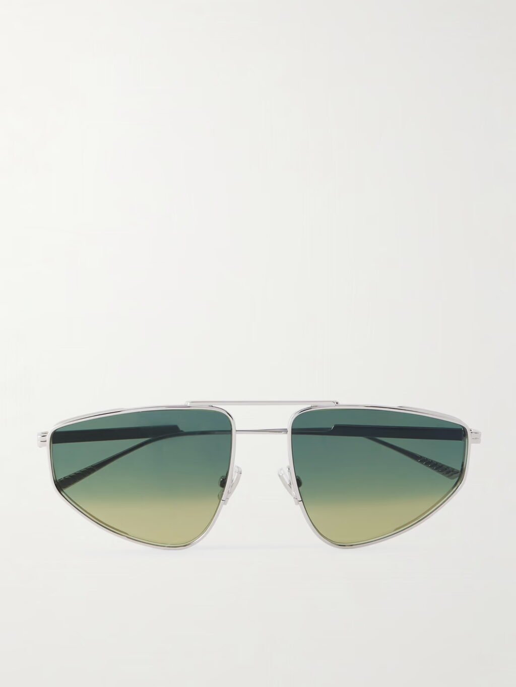 Bottega Venetas ”Light Ribbon” är en ultramodern tolkning av pilotbågar. De är tillverkade i silverfärgad metall, har spegel- och gradientlinser med UV-skydd och är graverade med diskreta logotyper vid tinningarna.