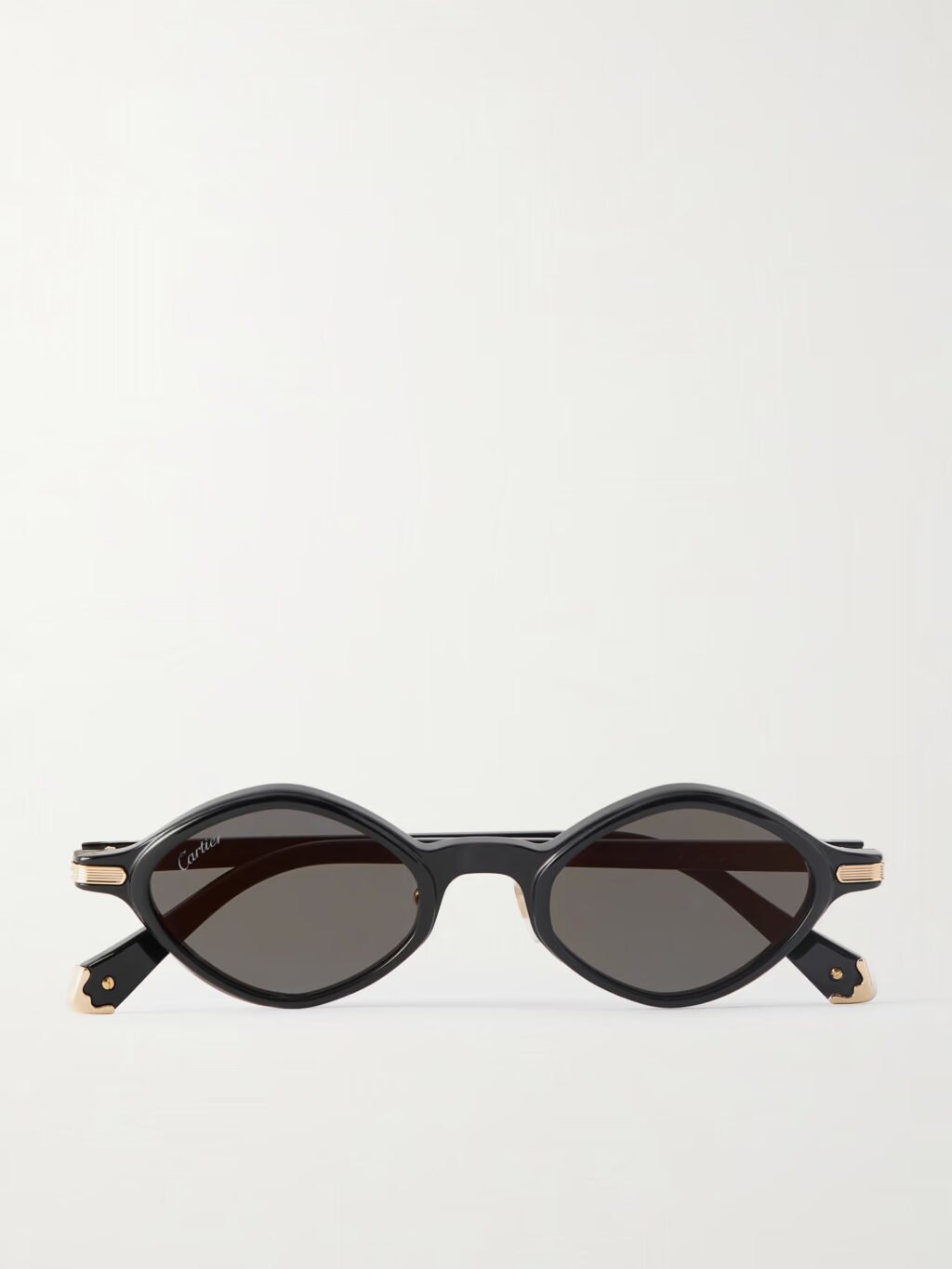 Superlyxiga solglasögon med oval form i glansig acetat. De sitter på smala skalmar och accentueras av guldfärgade detaljer vid gångjärn och ändar.