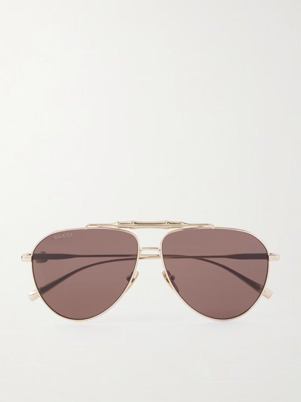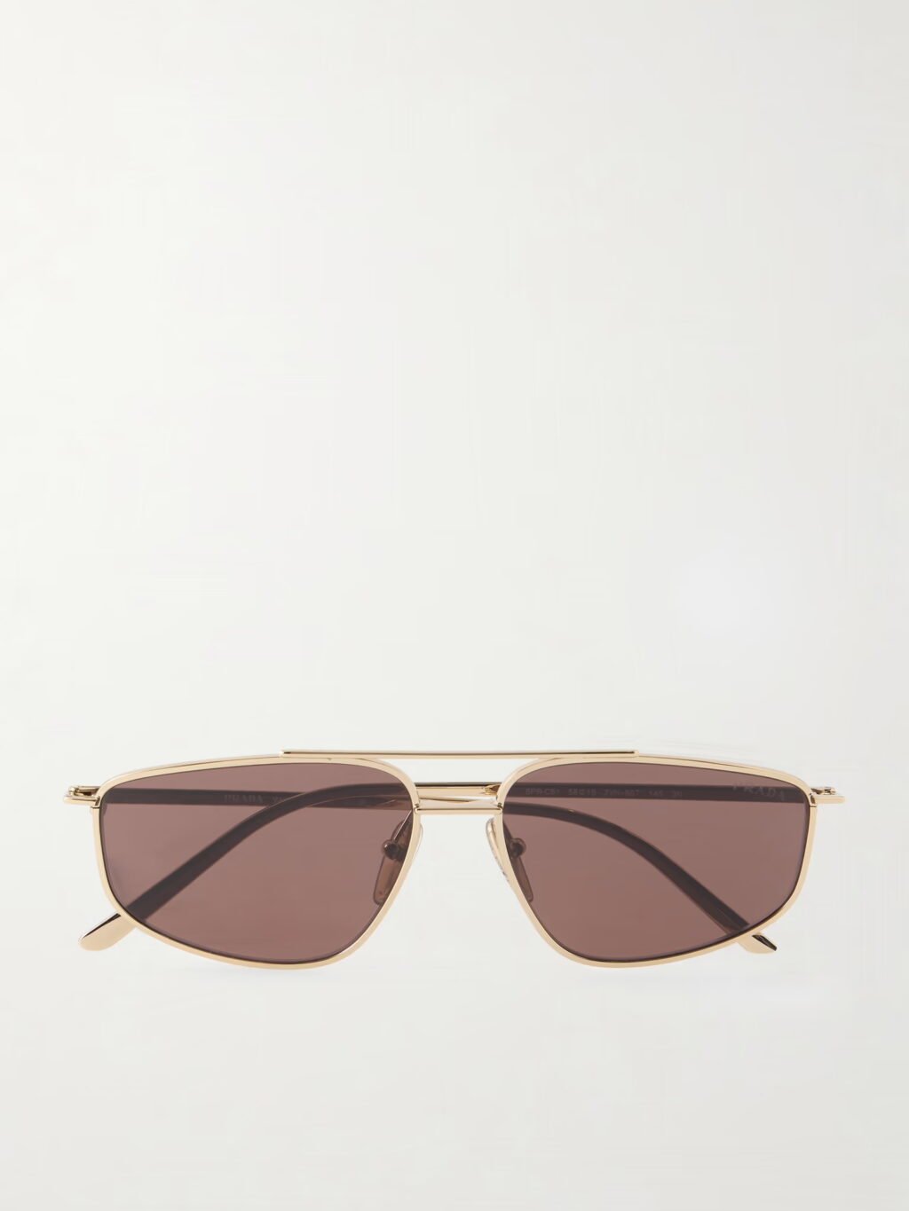 Denna modell från Prada påminner om pilotmodeller men har mer eleganta och strömlinjeformade proportioner. De är tillverkade i guldfärgad metall och har mauvefärgade (en mjuk ton av lila och rosa) linser.